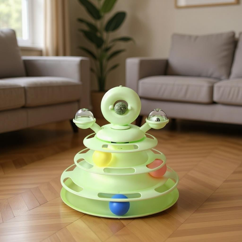 Met vier verdiepingen vol ballen en speelelementen kan je huisvriendje uren bezig zijn.